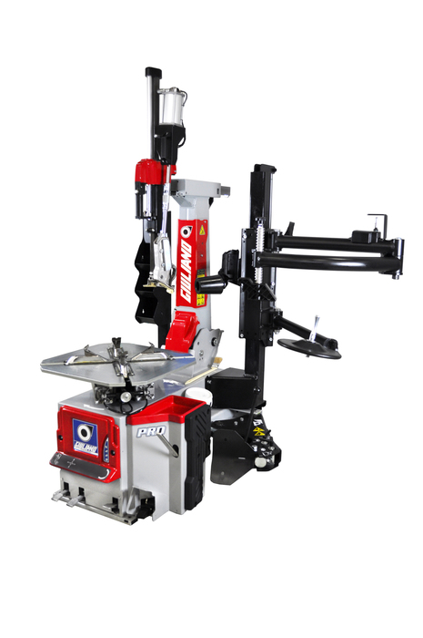 Montážní stroj pro kola osobních a lehkých užitkových automobilů s odklopným zadním ramenem a pomocnými rameny. Automatický palec pro práci bez montážní páky.